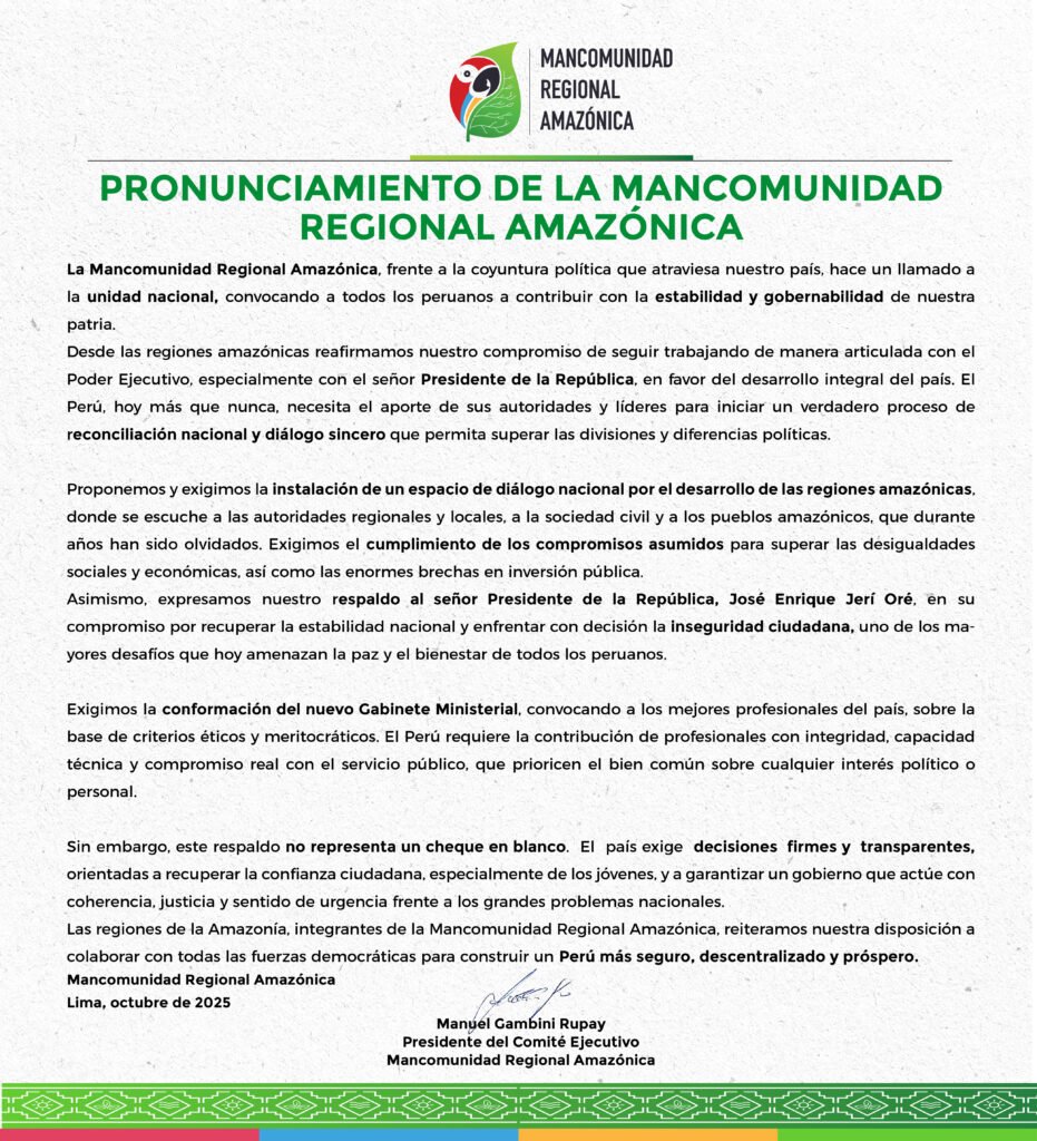Las regiones de la Amazonía, integrantes de la Mancomunidad Regional Amazónica, reiteramos nuestra disposición a colaborar con todas las fuerzas democráticas para construir un Perú más seguro, descentralizado y próspero.
